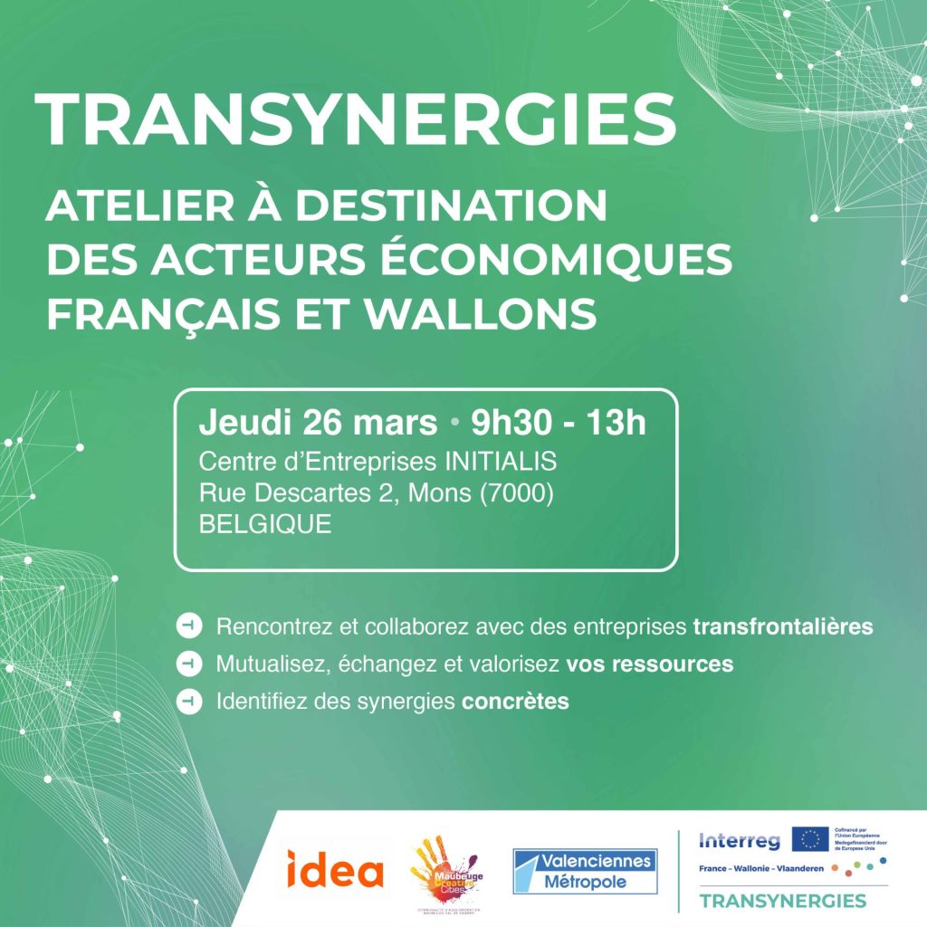 Le 26 mars 2026, IDEA organise à Mons, en partenariat avec la Communauté d’Agglomération Valenciennes Métropole (CAVM) et la Communauté d’Agglomération Maubeuge Val de Sambre (CAMVS), le premier atelier TRANSYNERGIES dédié à la détection de synergies inter-entreprises dans une logique d’économie circulaire.