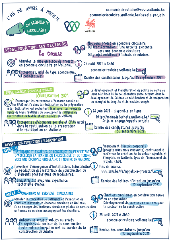 Pour plus d’informations sur ces appels à projets, leurs financements, critères de sélection et dates limites de remise des candidatures, rendez-vous sur le site de l’économie circulaire en Wallonie : https://economiecirculaire.wallonie.be/appels-projets.